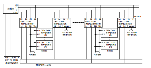 b)與消防電話二總線采用兩線連接,無極性,與消防電話分機采用四線連接