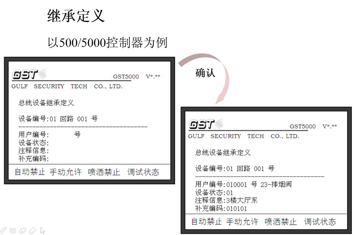 控制器所接的可編址外部設備均需進行編碼設定,每個設備對應一個原始編碼(一次碼,如下圖紅色數字)和一個用戶編碼(二次碼,如下圖藍色+綠色數字構成完整的二次碼),設備定義就是對用戶編碼進行設定。被定義的設備既可以是已經注冊在控制器上的,也可以是未注冊在控制器上的。