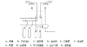 本系統的主要設備和器材包括:啟動氣瓶、啟動氣瓶、滅火劑瓶組、控制器、選擇閥、安全閥、容器閥、噴嘴等。