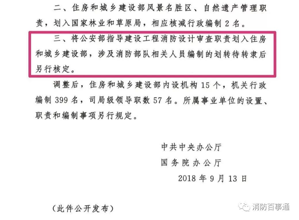 此前中央辦公廳曾正式發(fā)文,將公安部指導建設工程消防設計審查職責劃入住房和城鄉(xiāng)建設部,涉及消防部隊相關人員編制的劃轉待轉隸后另行核定。