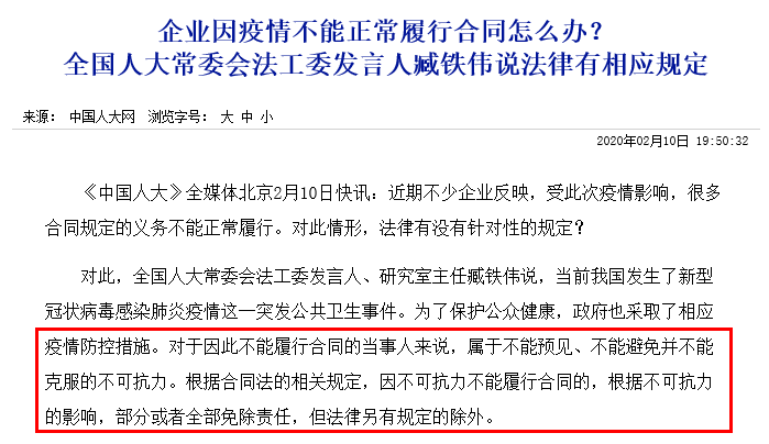 全國人大法工委:新冠肺炎疫情屬于不可抗力!