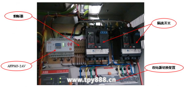 本商場綜合樓項目的AFPM3-2AV三相交流雙電源電壓傳感器安裝于斷路器或隔離開關的輸出端和雙電源切換裝置的輸入端之間,主電源電壓信號接1,2,3,4這四個端子,備用電源電壓信號接5,6,7,8這四個端子,以位于地下室區域的消火栓泵配電箱雙電壓監控為例,傳感器AFPM3-2AV安裝位置示意圖如圖2所示,實物安裝位置圖如圖3所示,電壓信號接線示意圖如圖4所示。