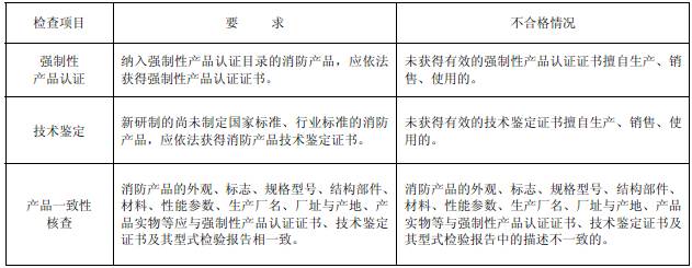 消防產品的現場檢查主要包括市場準入檢查和產品質量現場檢查兩類。顧名思義,市場準入檢查是針對產品是否符合國家有關市場準入規定所進行的檢查。而產品質量現場檢查則是針對產品的一些關鍵性能,在現場采用相應檢查方法進行的產品質量檢查。當市場準入檢查不合格時,可不繼續進行產品質量現場檢查而進行判定。