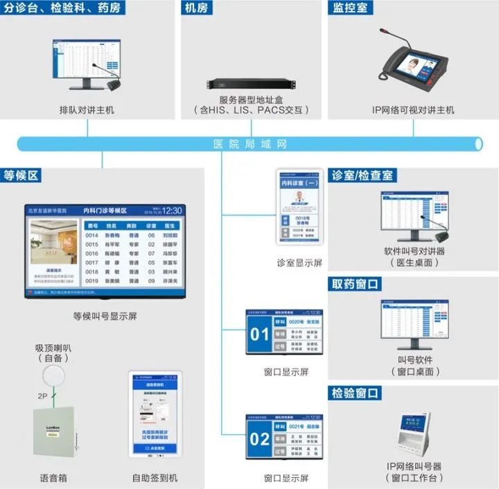系統采用6類網線,網絡式架構;候診區設置IPTV電視及復診自助簽到機;每診室設置1臺顯示屏;門診樓設置LED大屏、LED條屏;急診、出入院辦理、收費窗口、取藥處、采血處設置窗口顯示屏。