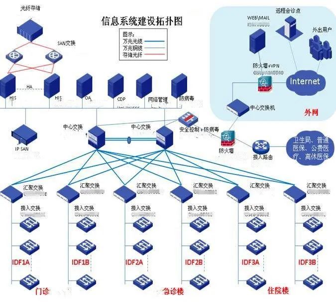 • 綜合布線內網--辦公網綜合布線外網--連接Internet設備網--智能化網專網--連接衛生局、醫保