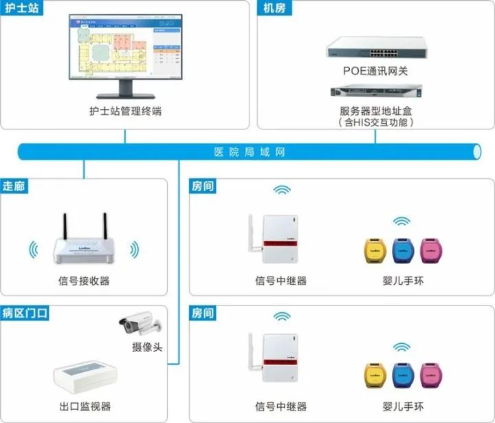 嬰兒防盜系統連接醫院外網,設置于住院樓3層產科區病房、4層VIP科區病房+一體化家患產房、5層月子房;實時定位嬰兒位置、可形成運動軌跡圖,家屬可通過APP查看。