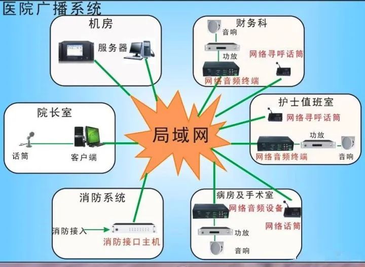 系統采用網絡式架構并與消防系統聯動;控制優先級緊急廣播、語音廣播、背景音樂廣播;護士站設置尋呼話筒和音量調節設備。