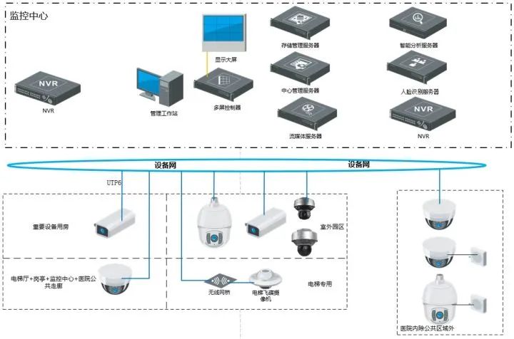 系統采用超五類網線,網絡式架構;醫院各出入口、候診區、內部公共走廊采用人臉識別攝像機;院區出入口、內部公區采用人臉識別攝像機;在南、北樓之間設置全景攝像機,立體監視;搶救室、護士站、ICU、手術室等特殊區域位置監控圖像單獨存儲,可根據需求單獨管理。
