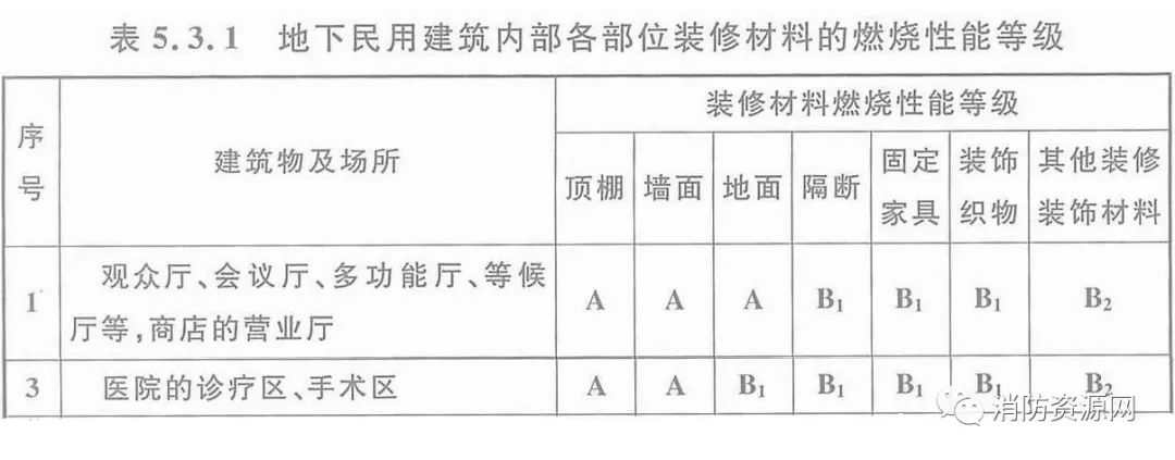 三、地下建筑中的醫院診療區、手術區,內部各部位裝修材料的燃燒性能等級,不應低于《建筑內部裝修設計防火規范》表5.3.1的規定。