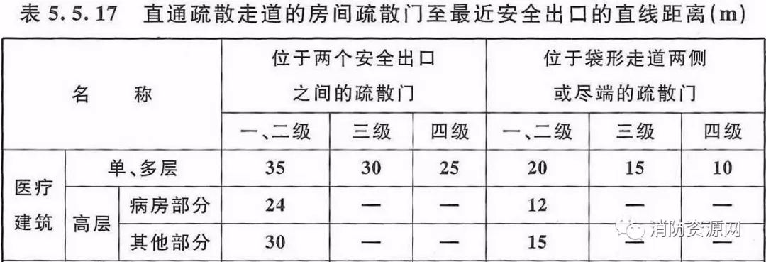 2、醫療建筑直通疏散走道的房間疏散門至最近安全出口的直線距離,不應大于《建規》5.5.17的規定。