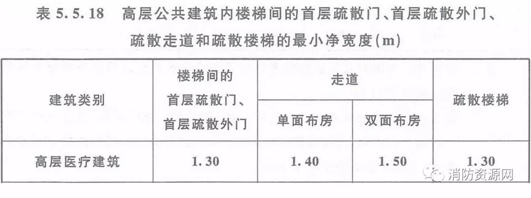 2、高層醫療建筑內樓梯間的首層疏散門、首層疏散外門、疏散走道和疏散樓梯的最小凈寬度(m),尚應符合《建規》表5.5.18的規定。