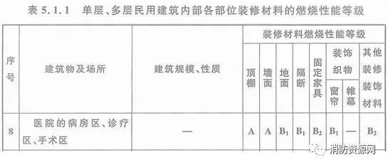 一、單層、多層醫院建筑的病房區、診療區、手術區,內部各部位裝修材料的燃燒性能等級,不應低于《建筑內部裝修設計防火規范》表5.1.1的規定。