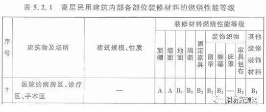 二、高層醫院建筑的病房區、診療區、手術區,內部各部位裝修材料的燃燒性能等級,不應低于《建筑內部裝修設計防火規范》表5.2.1的規定。