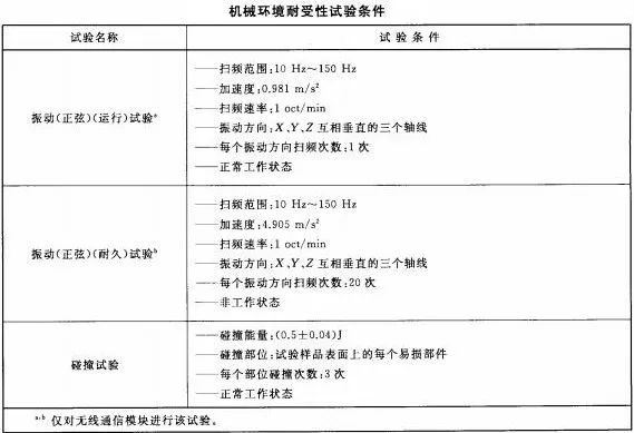 系統(tǒng)應(yīng)能耐受下表所規(guī)定的機(jī)械條件下的各項(xiàng)試驗(yàn)。試驗(yàn)期間,系統(tǒng)應(yīng)無機(jī)械損傷和緊固部位松動現(xiàn)象;試驗(yàn)后,系統(tǒng)應(yīng)保持正常無線通信狀態(tài)。